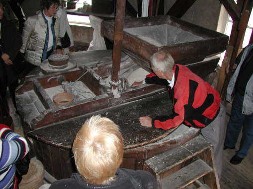....erläutert die Funktion des historischen Gerätes. Die Mühle hat drei Steinmahlgänge, einer davon ist funktionsfähig und wird gelegentlich zu Schauzwecken in Betrieb genommen.