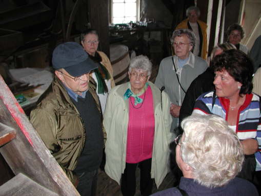 Rüdiger Heßling (lks.), ebenfalls Vorstandsmítglied der Mühlenvereinigung,erzählt aus der Geschichte der Wallmühle, z.B. über die verschiedenen klangvollen Namen, die sie im Laufe ihres Lebens trug, wie Herdentorswallmühle, Mühle auf der Gießhausbastion, Mühle bei der Blumenschule, Ansgaritormühle, Mühle am Wall oder Wallmühle.
