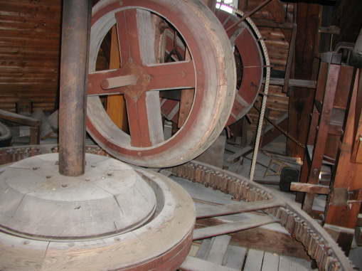 Ein Storchennest in der Wallmühle ?! - Da staunt der Laie und mancher Mühlenfreund wundert sich! - Als “Storchennest” wird die auf der Königswelle oberhalb des Stirnrades sitzende hölzerne Antriebsscheibe bezeichnet, die einen Sackaufzug antreibt. Die Kraftübertragung erfolgt durch den Reibungswiderstand der beiden aufeinander laufenden Holzscheiben. Immerhin können damit bis zu sechs gefüllte Säcke (ca. sechs Zentner) auf einer Holzpalette gleichzeitig gehoben werden.