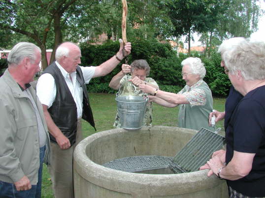 Die Betätigung der funktionsfähigen Sootwippe am Gildehaus war auch für die Teilnehmer des Dämmerschoppens von besonderem Reiz, zumal auch hier jene kleinen grundwassergekühlten Köstlichkeiten vermutet wurden, die das Mühlenfest überstanden hatten.
