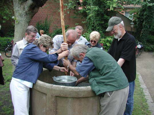 Was hier viele Hände unter wachsamen Augen bewerkstelligen, war früher eine reine Frauenarbeit. An Normaltagen waren es bis zu 460 Liter oder rd. 9 Zentner die für einen Durchschnittshof von 20 - 80 Morgen zu schöpfen, zu transportieren und zu verarbeiten waren. Dieser Bedarf steigerte sich an Putz-und Backtagen und konnte an Waschtagen bis zu 760 Liter oder rd.15 Zentner erreichen. Quelle: Schriften des Freilichtmuseums am Kiekeberg, Band 7