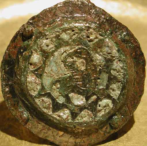 Der Greif ist ein legendäres Fabelwesen, das uns als geläufiges bildliches Motiv heute vor allem noch in der Heraldik begegnet. Im Wappen von Mecklenburg- Vorpommern ist der prächtige “Pommersche Greif” ein Musterbeispiel für die bildliche Darstellung dieses Mischwesens. Auf dem Leib eines Löwen sitzt ein Vogelkopf, meist eines Adlers, aus dessen weit geöffnetem Schnabel eine gerollte Zunge herausragt. Der Löwenleib ist mit Flügeln ausgestattet und an den Füssen befinden sich kräftige Krallen. Der Greif gilt in der Heraldik als Sinnbild für Stärke und Wachsamkeit. Älteste Darstellungen des Greifenmotivs finden sich im Mittleren Osten in der Malerei und Bildhauerei der Babylonier, Assyrer und Perser, dort werden daher auch seine Ursprünge vermutet. Auch in der christlichen Symbolik wird eine Bedeutung des Greifen bezüglich der Auferstehung und Himmelfahrt Christi gesehen. Dass das Motiv dieses Fabelwesens auch in der Gebrauchskunst des frühen Mittelalters eine Rolle spielte, beweist ein Fundstück, das von der Bardowicker Schülerin Maren Erdmann im August 1989 auf einem Acker an der St.-Wilhadi-Strasse, also innerhalb des historischen Kernbereichs Alt-Bardowicks, entdeckt wurde. Es handelt sich um eine große Scheibenfibel aus 2,0 mm starker Bronze mit einem Durchmesser von 6,0 cm mit Emaileinlage und Greifendarstellung aus dem 10. Jhdt.