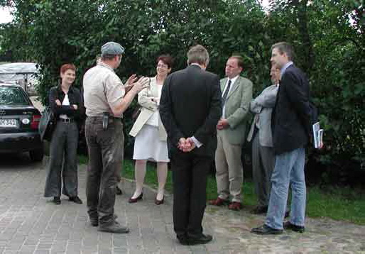 Eine sichtlich gut gelaunte Regierungspräsidentin (Mitte) mit ihrer Begleitung bei der Begrüßung auf dem Mühlenhof durch Müllermeister Eckhard Meyer