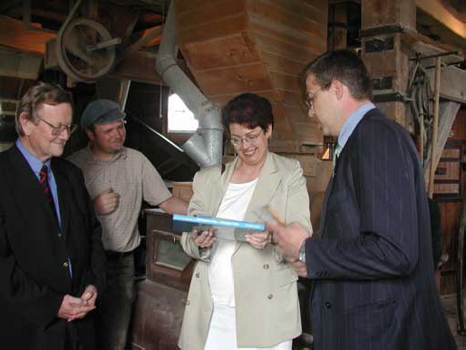 Müllermeister Andreas Engel, Vorsitzender des Mühlenfördervereins Lüneburg, überreicht der Regierungspräsidentin zur Erinnerung an ihren Antrittsbesuch an der Niedersächsischen Mühlenstrasse eine Dokumentation “Alte Mühlen-Neu entdeckt” und den Reiseführer “Mühlen zwischen Elbe und Aller”.