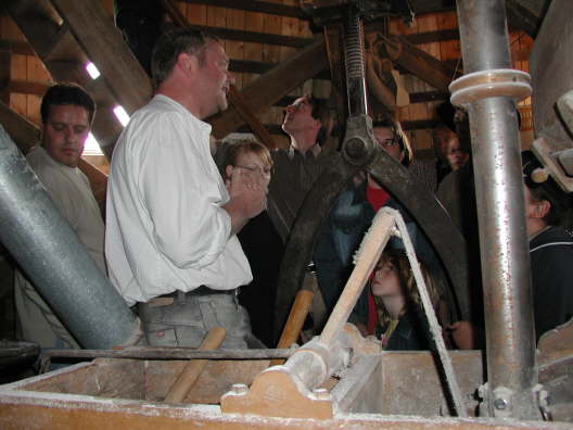 Die Vorführung traditioneller Verarbeitungsmethoden wie z. B. der Vermahlung mit einem windgetriebenen Steinmahlgang, aber auch “modernerer” Techniken wie die Feinmüllerei im Walzenstuhl, die Darstellung der Produktionsabläufe und ihre Aufteilung in vier übereinanderliegenden, “Böden” genannten Arbeitsebenen und der vertikalen Transportwege zwischen diesen, die Schilderung der Reinigungs- und Siebtechnik - kurz, aller Produktionsschritte bis zum fertigen Produkt lassen eine Mühlenbesichtigung für alle Beteiligten zum Höhepunkt eines Mühlentages werden.
