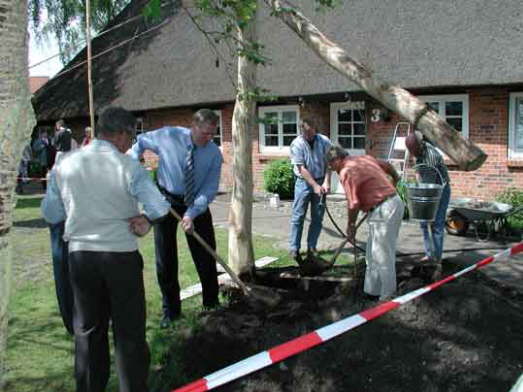 Dat Tausmeten, dat is nu een ganz wichtige Arbeid un dat is so richtig wat vör uns Rathmann Manfred Harms. Löcker taumaken, de annere utsmeten hevt, dat is sien Metier. He harr sick so in Rage schüffelt, dat he dat Schakett uttrocken müß un he harr ok en poor lütte Sweetdrüpen vörn Koppe.