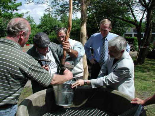 Nu kummt de groote Moment, dat Börgermester Dubber ton eerstenmol den nien Zinkemmer in Soot fieren un hochtrecken sall, över toeerst mut Heinz Schulz, uns Mann vör alle Fälle, den Haken en beeten tauslagen, damit de Emmer nich utklinken kann, wenne up´t Woter klatschen deit.