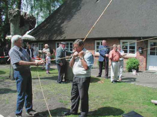 Nu sünd alle up`n Posten un hoolt sick an`n Reep fast un hüürt andächtig de Wöör von de nie Börgermeester Dubber, de vertellt, dat hei sick freut, dat Bewick nu wedder en echten “Swengel” kreegen sall und hei givt ok dat Kommando taun Uprichten.