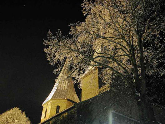 Die Glockentürme des beleuchteten Bardowicker Domes im Januar 2003